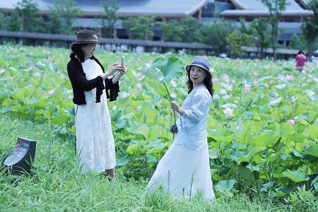 沿著蜿蜒的木棧道,穿梭于荷叢,游人伸手可觸蓮葉上的水珠,體驗“誤入藕花深處”的妙趣,仿佛置身“荷間仙境”,或身著漢服精美自拍或捕捉荷花與恢弘大氣的國際會議中心同框的經(jīng)典畫面,孩童在田埂邊賞花戲蜻蜓,卻與野鴨、水鳥不期而遇,笑聲與荷香交織,定格“詩畫江南”的美好瞬間。