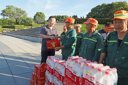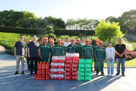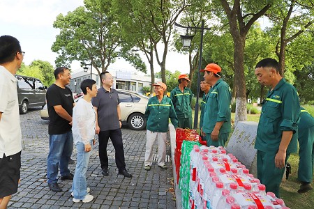 上午6點半,藍海綠業(yè)集團董事長宋極,公司副總裁謝春維,工會主席、質(zhì)安管理中心主任錢增龍,及養(yǎng)護管理部、質(zhì)安技術(shù)管理中心、總裁辦及各綠地養(yǎng)護片區(qū)負責人組成高溫慰問小組,先后來到院士公園、姜山獅山公園、橫溪、東錢湖陽光水岸、生態(tài)走廊、潘火潘火等養(yǎng)護項目、環(huán)衛(wèi)站現(xiàn)場,走訪慰問高溫作業(yè)的一線員工。